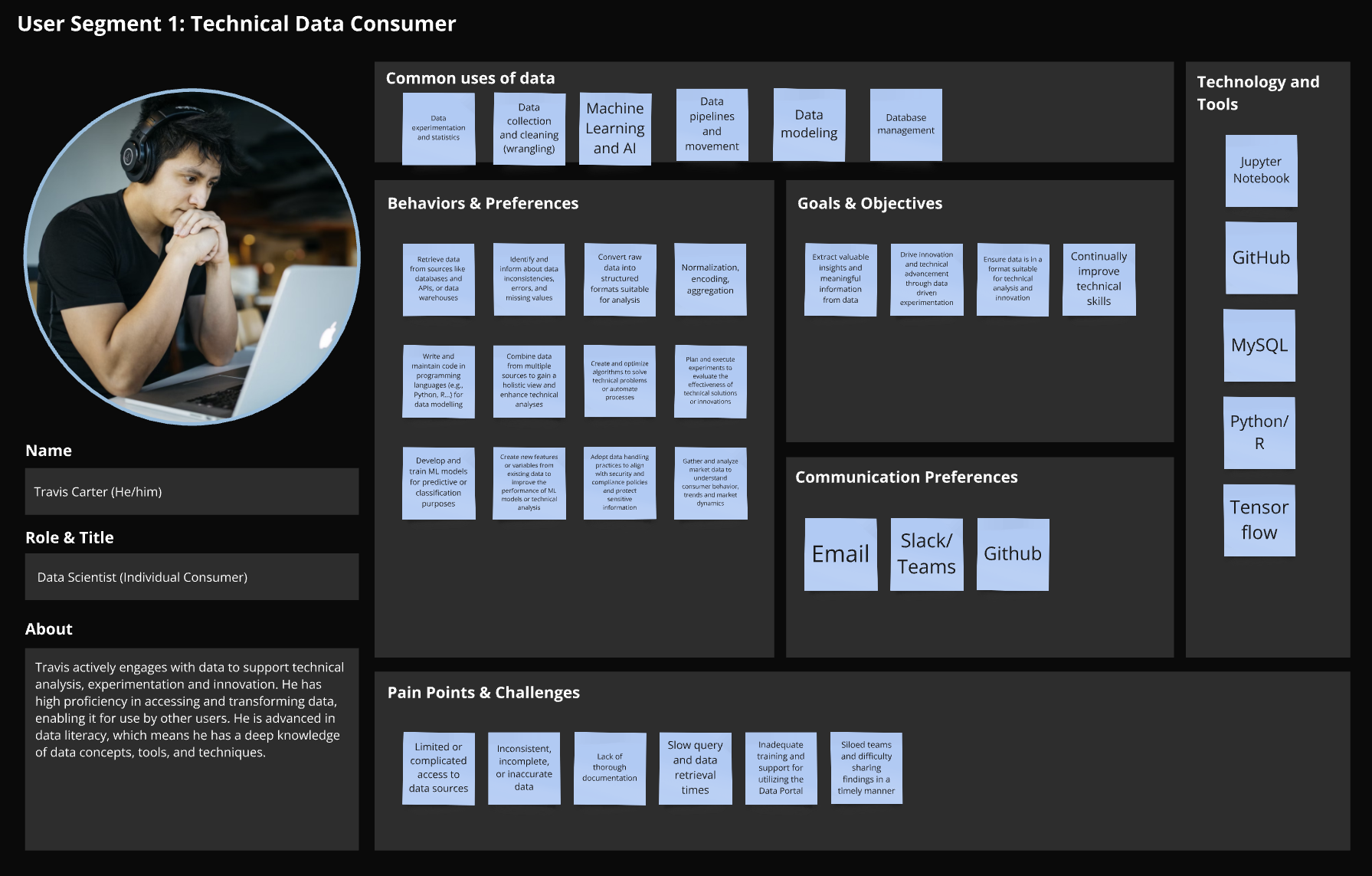 Initial set of 3 personas, segmented by data literacy and familiarity. (e.g., Travis, the Technical Data Consumer, and Babi, the Business Data Consumer).