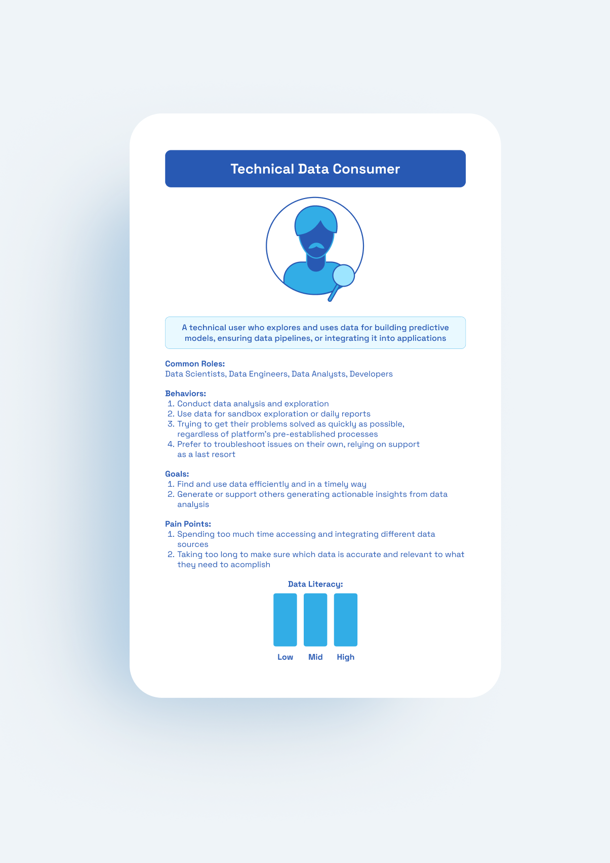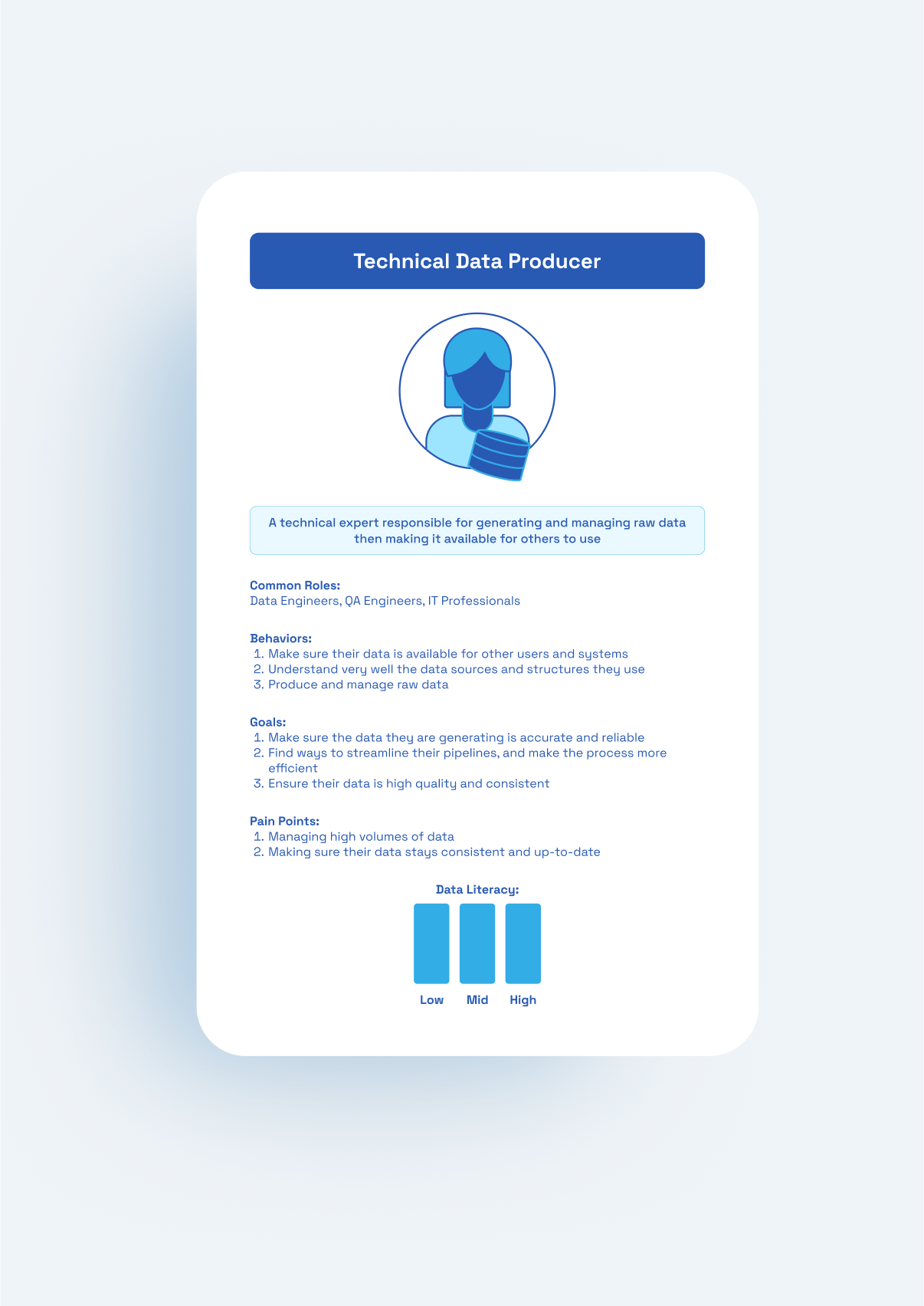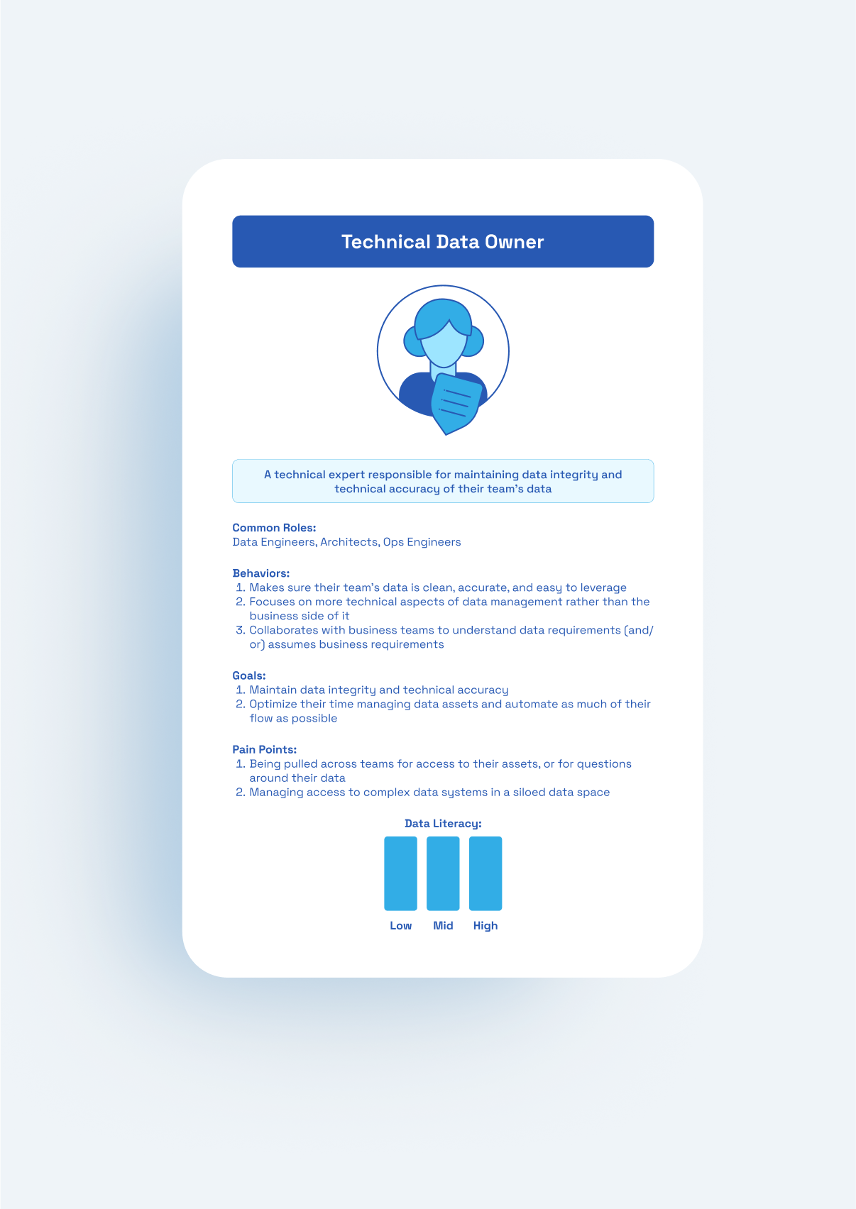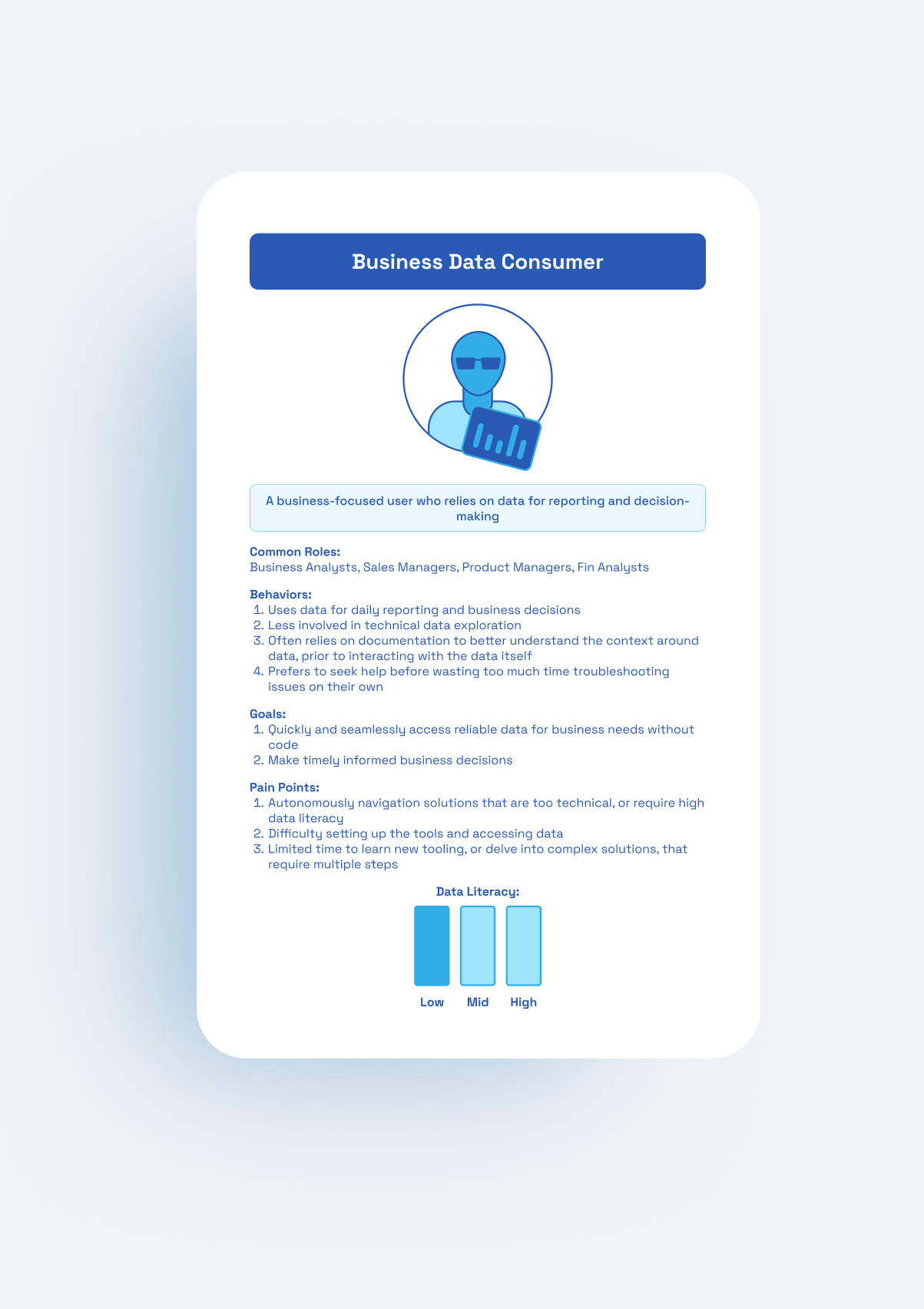 Standardized archetype template with: short intro, core roles, bullets for behaviors/goals/pain points, and a visual data-literacy indicator