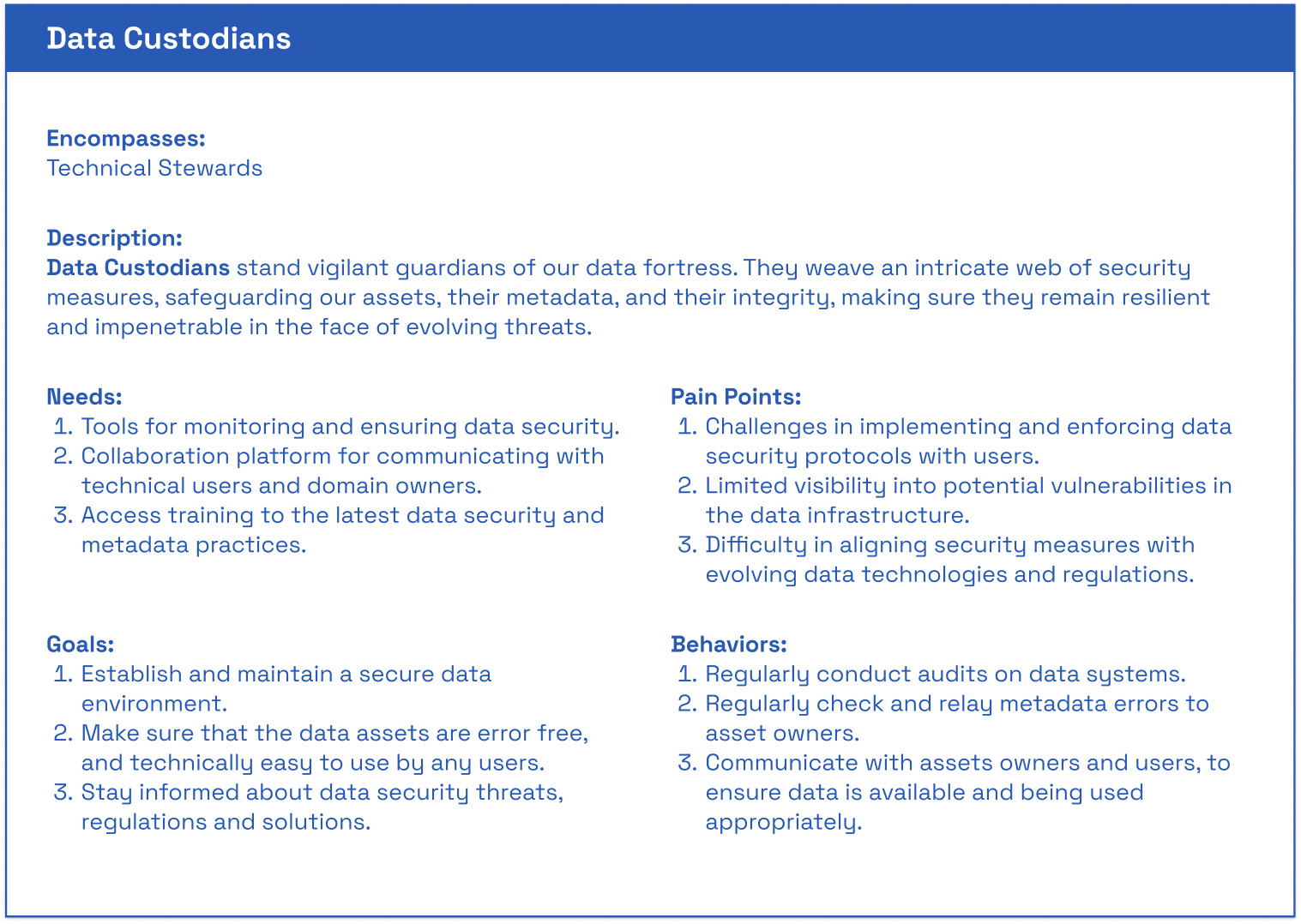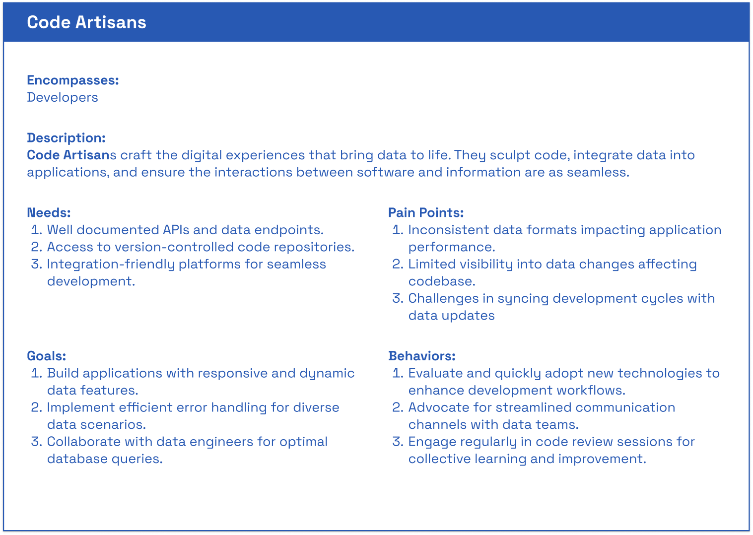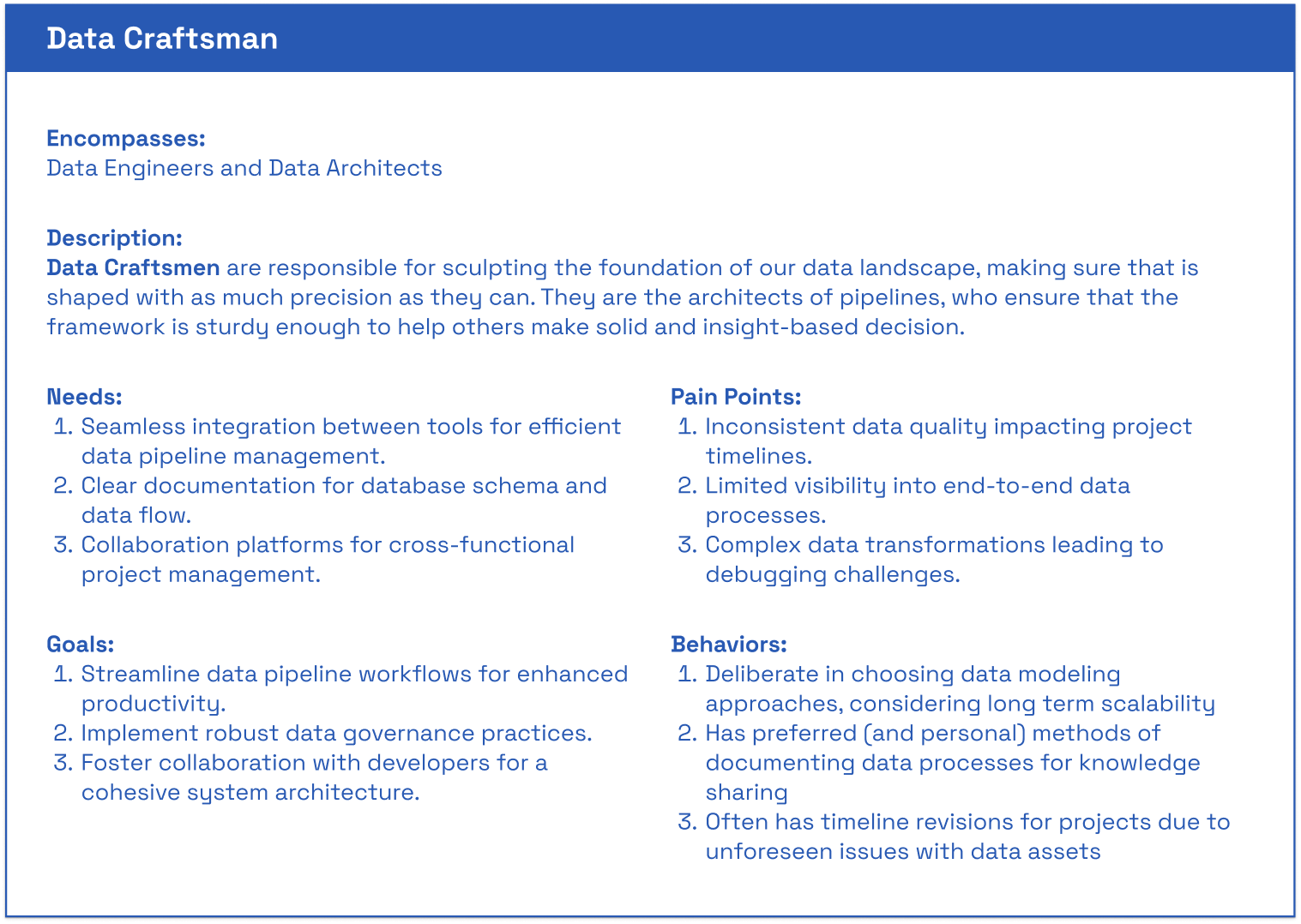 Conducted a Best Practices Audit in the persona frameworks built in the past, including from the Data Architect VP, a Consultant from a large company, the User support team, and the Platform director.