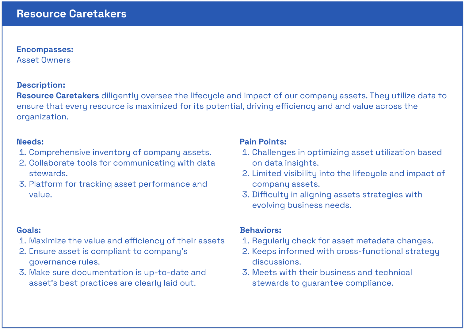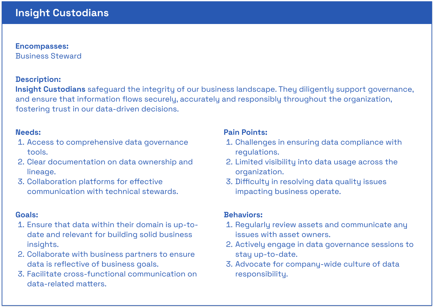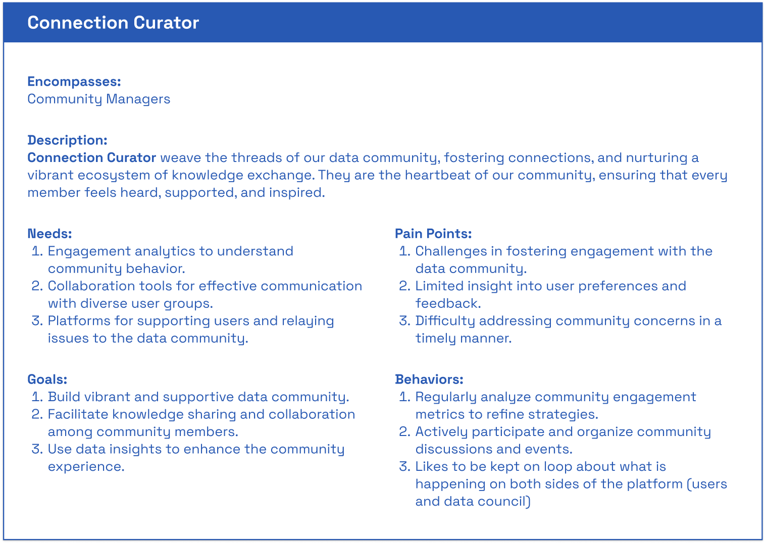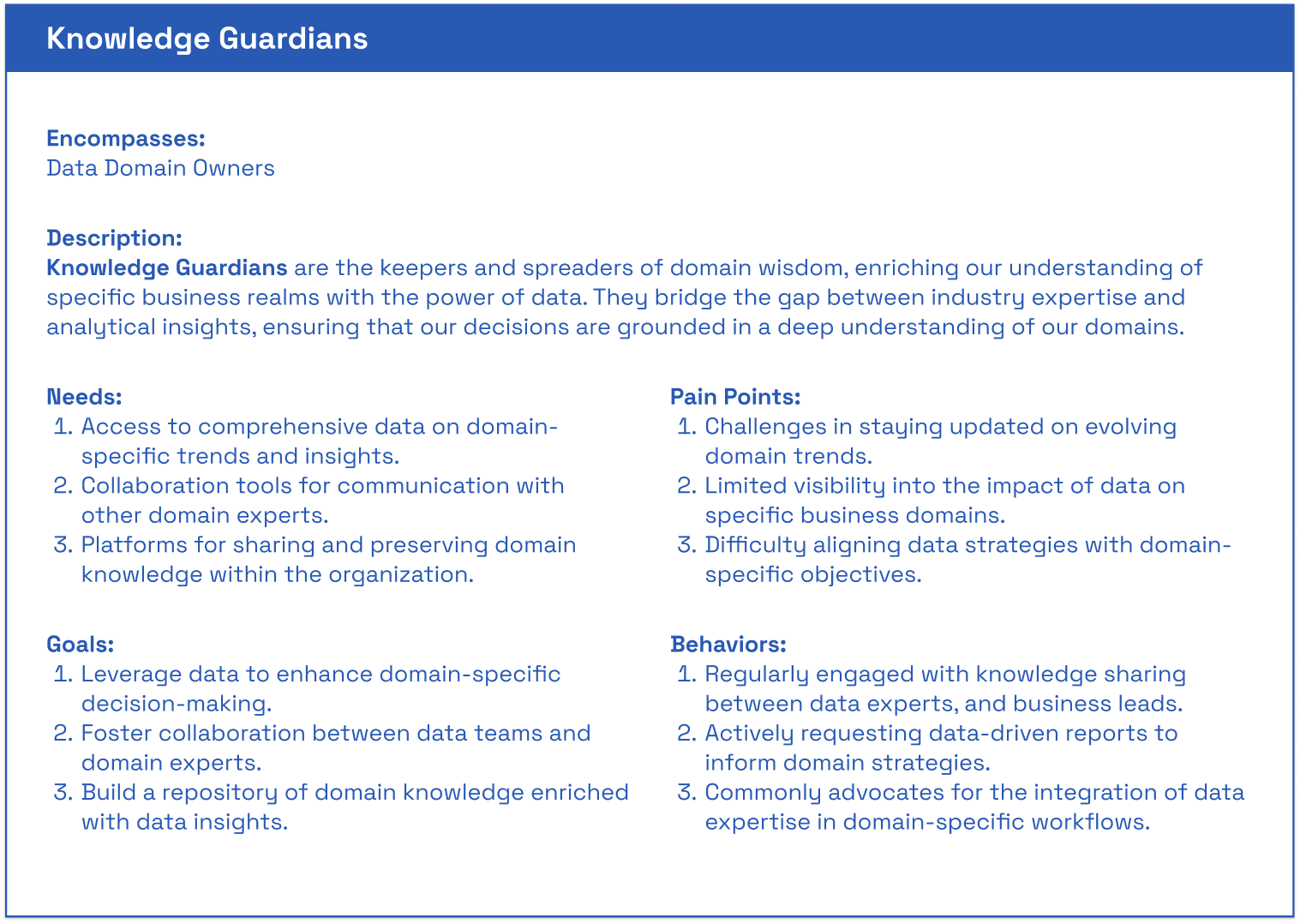 Conducted a Best Practices Audit in the persona frameworks built in the past, including from the Data Architect VP, a Consultant from a large company, the User support team, and the Platform director.