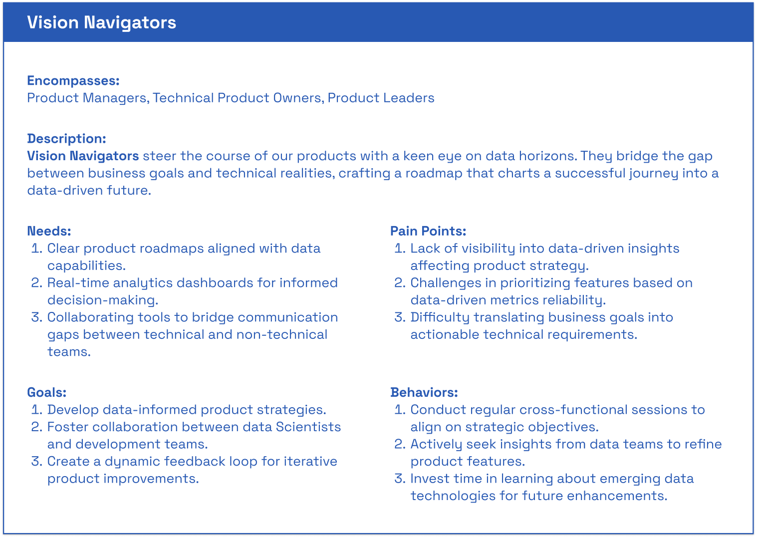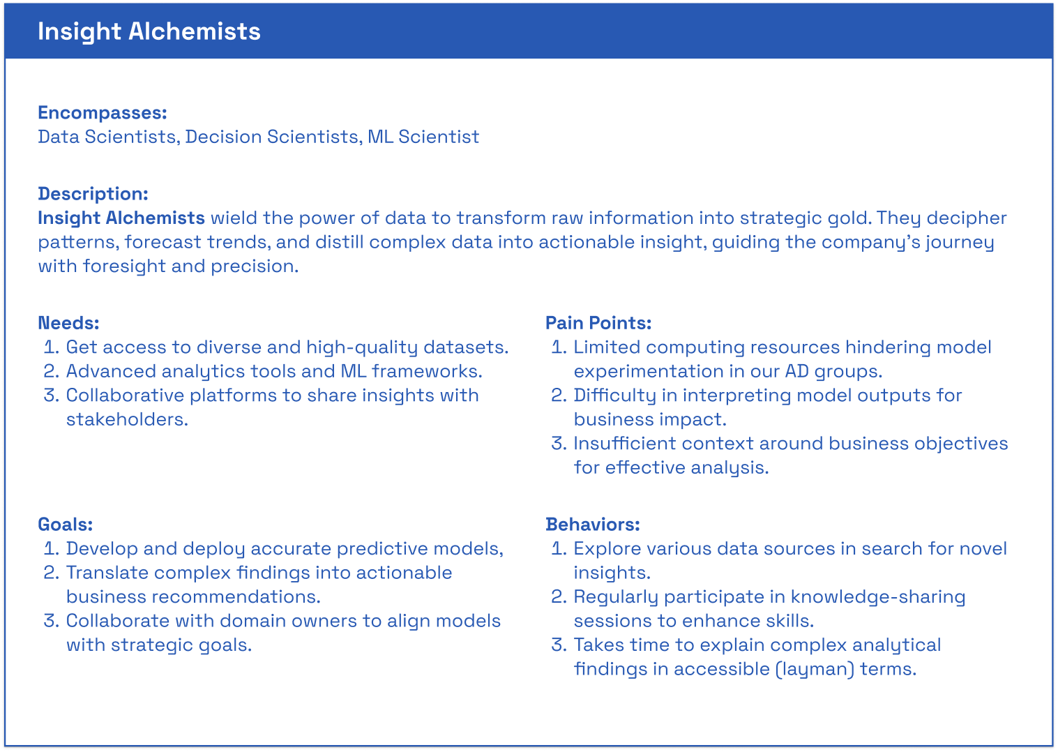 Defined each archetype with descriptive narratives, trying to capture their approach to data and decision-making.