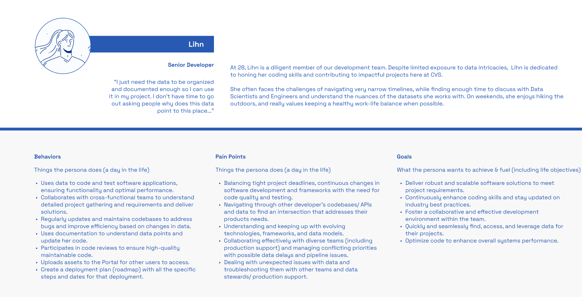 This six-month initiative at CVS Health produced a centralized, data-driven framework of five enterprise user archetypes. It aligned cross-functional teams around shared language and actionable insights, turning to be a crucial facilitator of user-centered enhancements to our data platform.